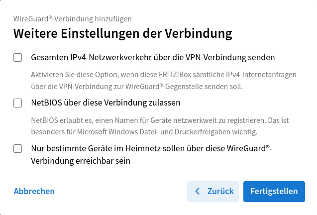 Soll die Verbindung gleichzeitig zu einer bestehenden WireGuard®-Verbindung der Gegenstelle genutzt werden? → Nein. Ich habe nicht geschaut, was "ja" an der Stelle bewirkt. Ich nehme an, davon hängt ab, ob ich eine vollständige Konfiguration kriege oder nur einen Schnipsel zur Ergänzung.